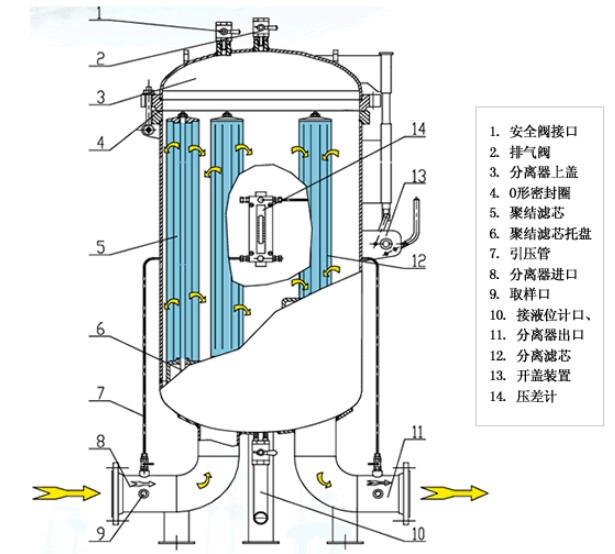 經過預處理的天然氣首先進入聚結分離器的下層集液空間, 由于體積膨脹,會有部分液體析出,這部分液體進入下層集液區:含液氣體向上進入聚結分離區,經過聚結濾芯的作用,聚結出的液滴越來越大,并逐漸移向分離區。