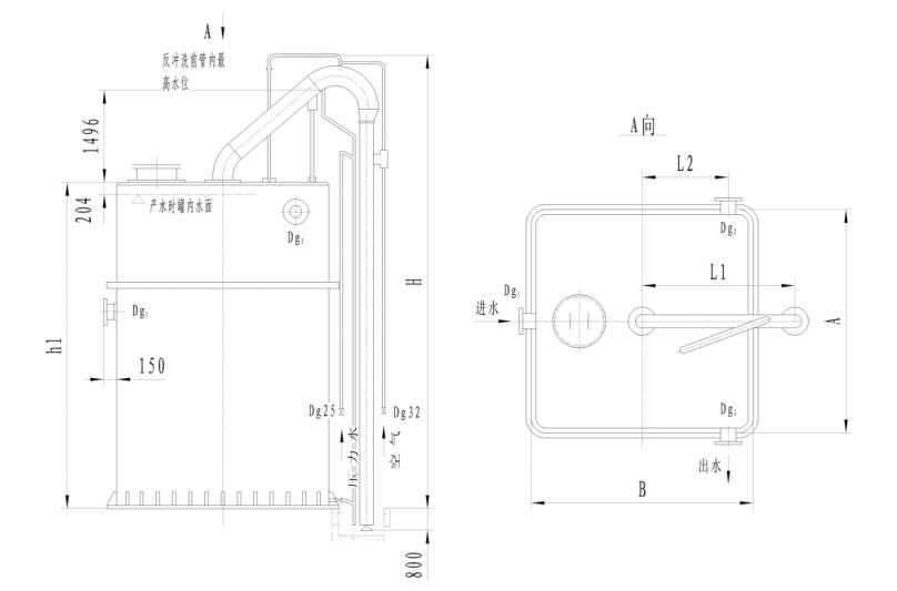自來水經(jīng)分配水箱進入進濾器,自上而下地過濾。由于濾層不斷截留進水中的懸浮物,濾層的水頭損失逐漸增加,使得虹吸上升,管沖中的水位上升。當水位上升進入虹吸輔助管內(nèi)的水射器時,由于水力作用將虹管內(nèi)的空氣帶走,形成負壓。當負壓到達設計值時,便發(fā)生虹吸現(xiàn)象,此時水箱中的水自下而上地反洗而得以“再生”。由于不斷反洗濾層,水箱中水位下降至規(guī)定值時,虹吸作用被破壞,反洗結(jié)束,過濾裝置又重新開始工作。
